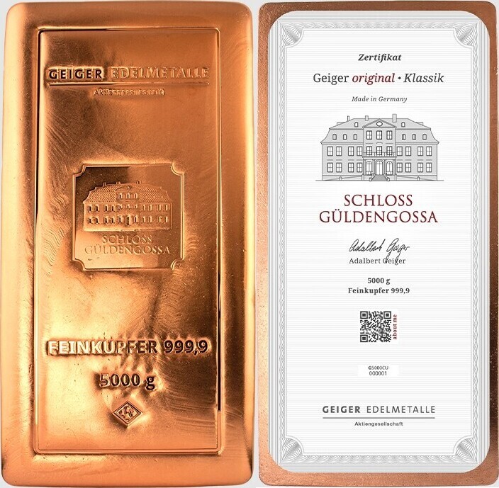 The 5kg copper bar from the edition Schloss Güldengossa is a unique product from Geiger Edelmetalle. In addition to the traditional investment metals, copper is increasingly interesting.